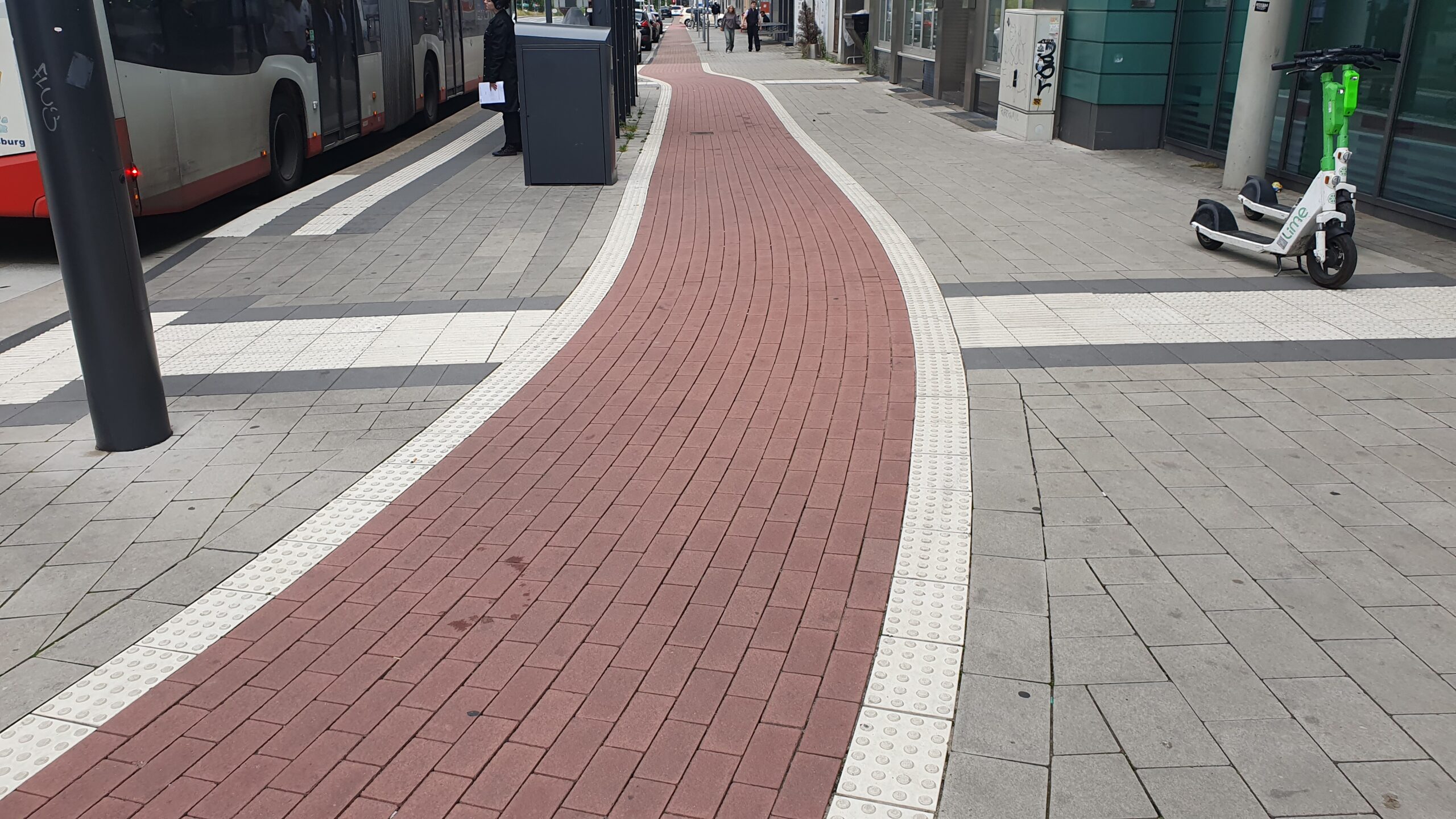 Trottoirs pavés ou divisés par une lignes blanche, pistes rouges qui ondulent sur la chaussées, enrobé réfléchissant, plaques décoratives au…